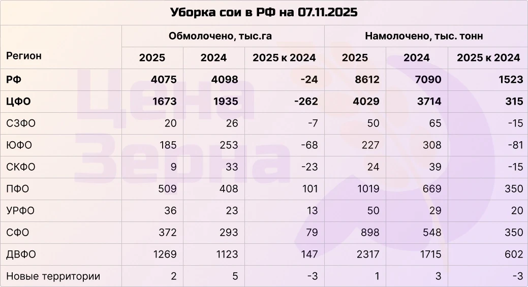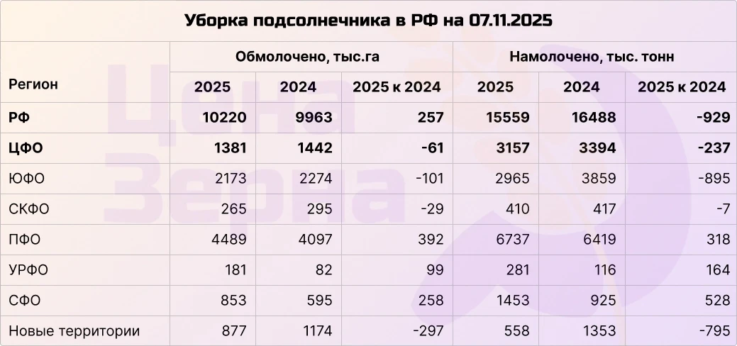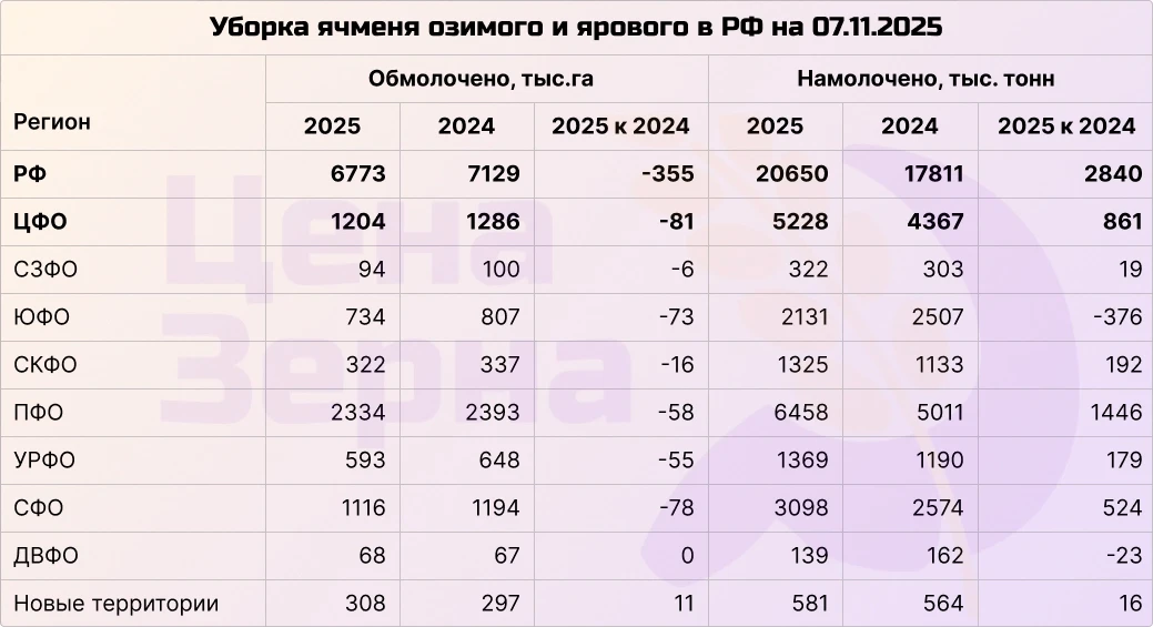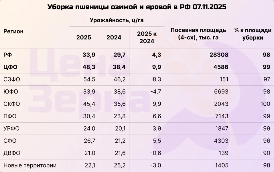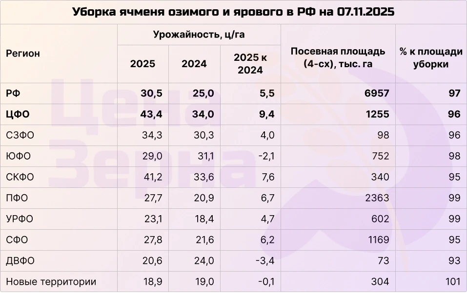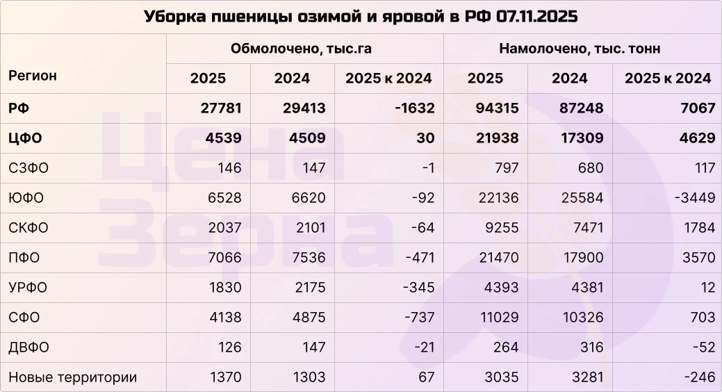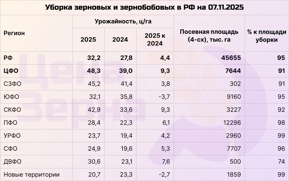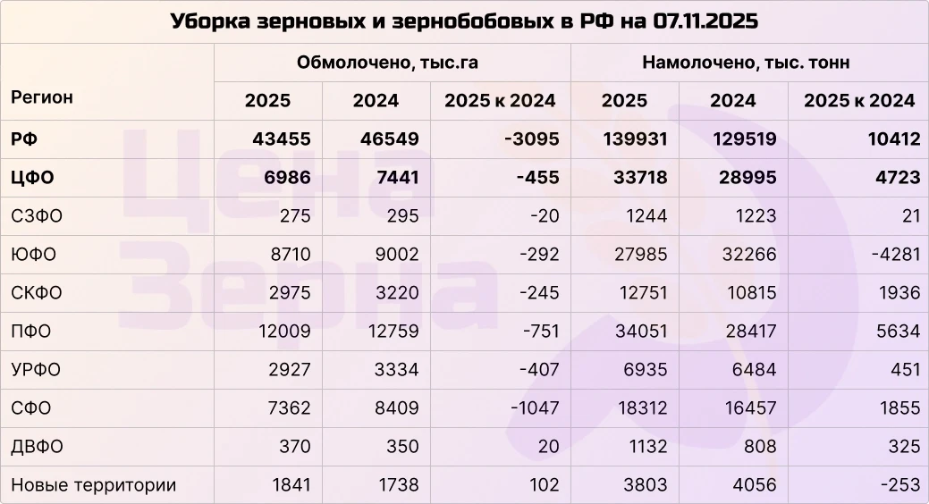 Давайте посмотрим на актуальные данные по уборочной 2025 по зерновым культурам на начало ноября.