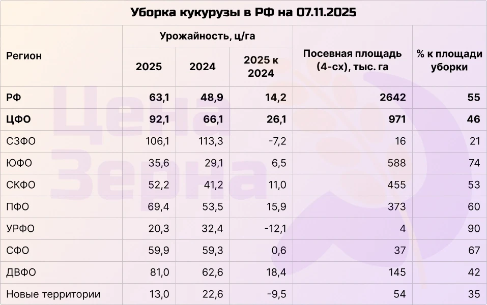 Уборка кукурузы продолжается в активной стадии, уже убрано больше половины. Намолочено более 9,2 миллионов тонн зерна с площади около 1,5 миллиона гектаров. Текущие показатели по-прежнему опережают прошлогодние: средняя урожайность по стране достигает более 63 ц/га, что почти на 15 центнеров выше уровня прошлого сезона. В то же время, пока фиксируются потери урожайности только на новых территориях и на Урале, в остальных регионах урожай демонстрирует лучшие результаты по сравнению с предыдущим годом.