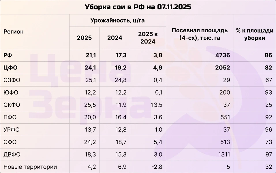 Производство зерна в РФ практически достигло 140 миллионов тонн в бункерном весе. Убрано около 96% посевных площадей. Однако темпы сборки замедлились, так как многие аграрии уже готовятся к следующему сезону, убирая поздние культуры — сою, кукурузу и подсолнечник. В активной фазе находятся только регионы Дальнего Востока. Остальные области завершили сбор более чем на 90%. Средняя урожайность выросла почти на 4,5 ц/га по сравнению с прошлым годом и составляет 32,2 ц/га. Уборка в этом сезоне практически завершена.
