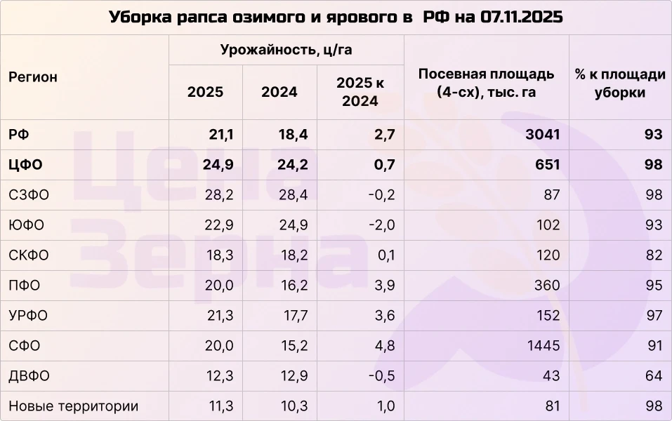 На начало ноября в РФ собрано 6 миллионов тонн рапса, что составляет около 93% от общих уборочных площадей. Уборочная кампания приближается к завершению, и прогнозы оправдались. Средняя урожайность по стране составляет 21,1 ц/га, что немного превышает прошлогодние показатели — 18,4 ц/га.