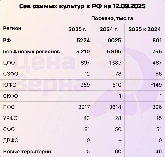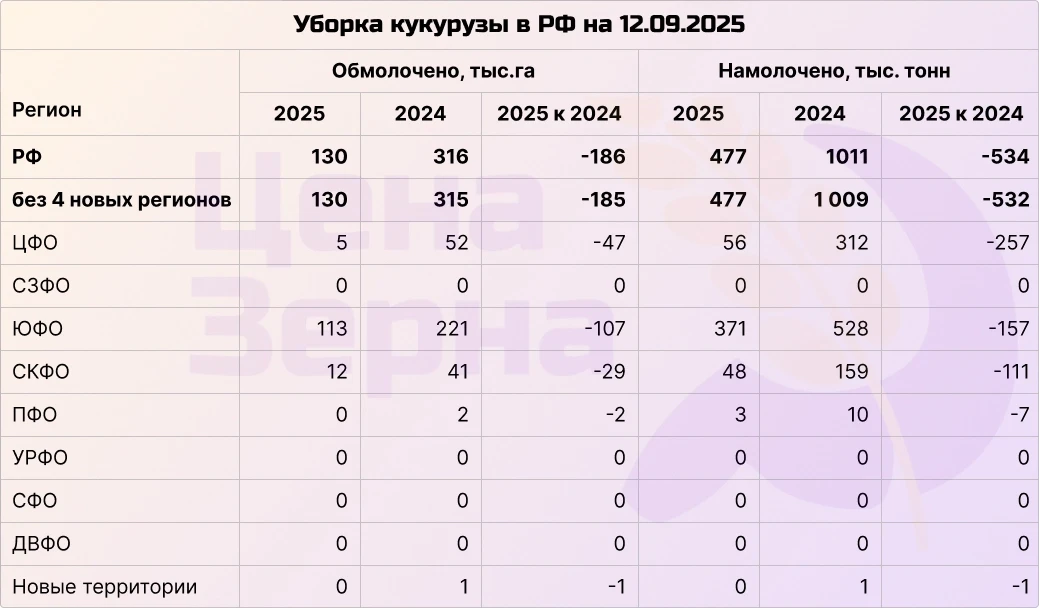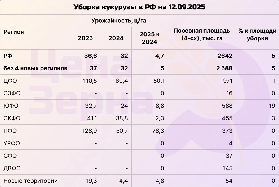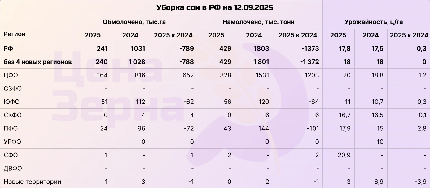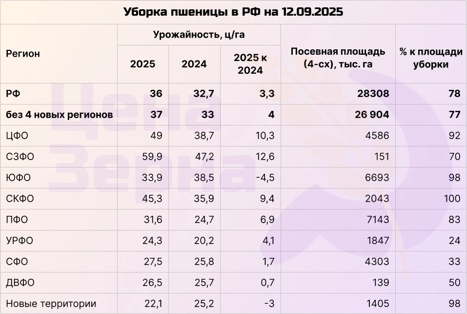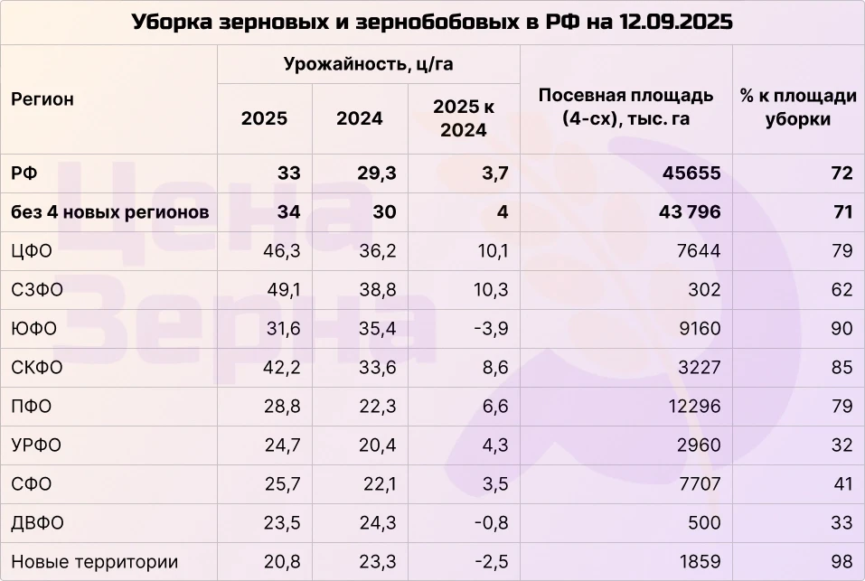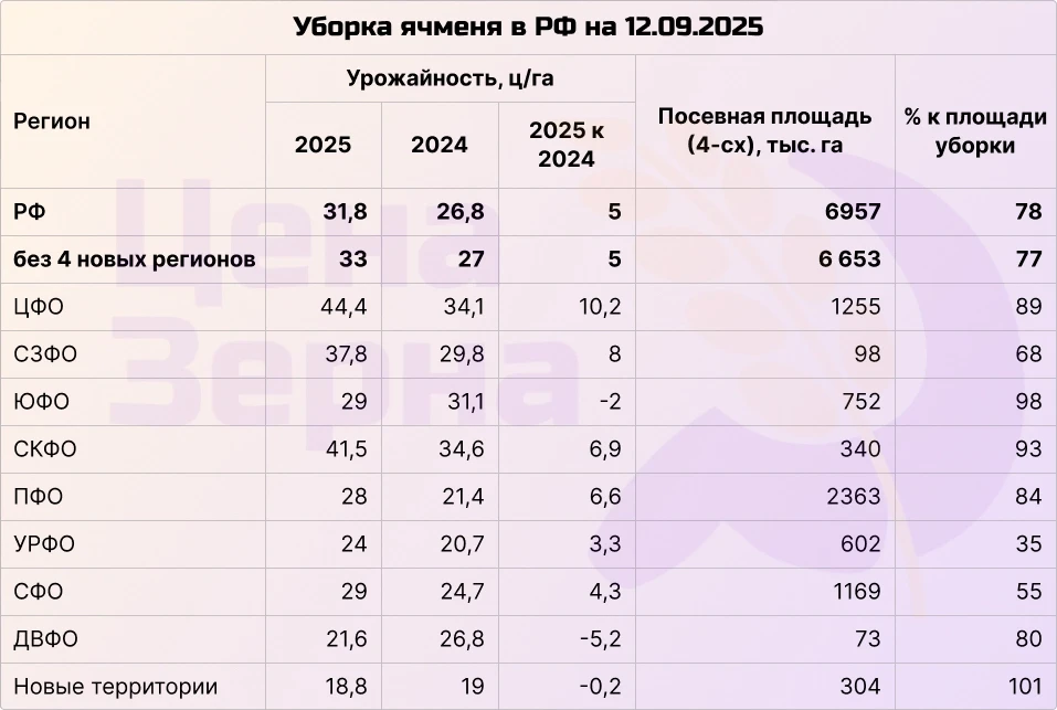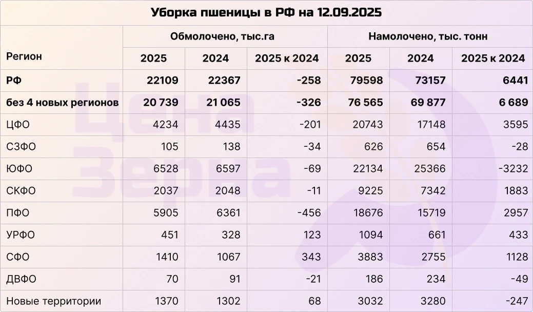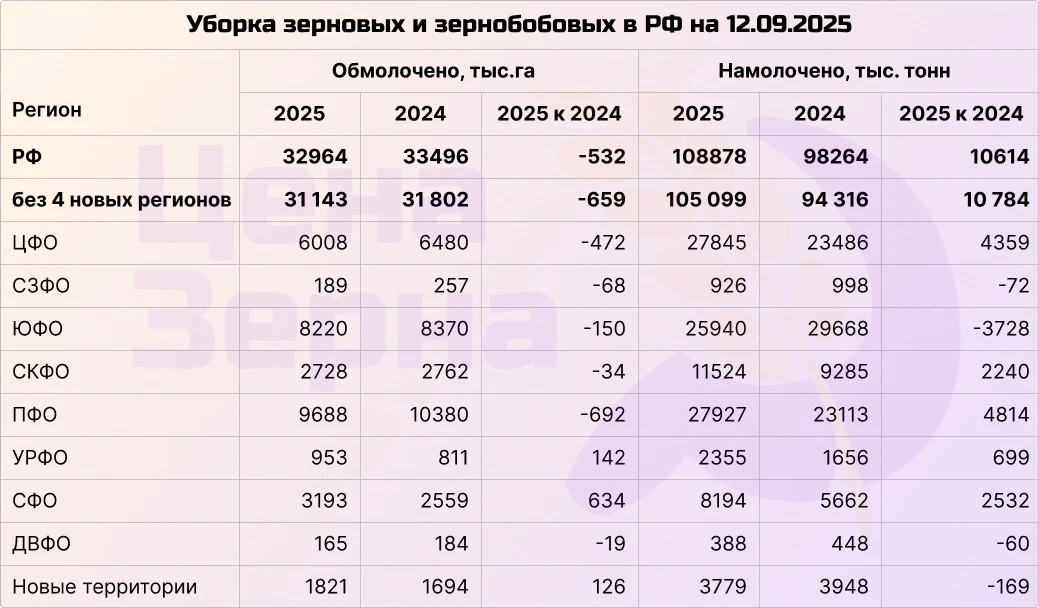 Давайте посмотрим на актуальные данные по уборочной 2025 по зерновым культурам на середину сентября.