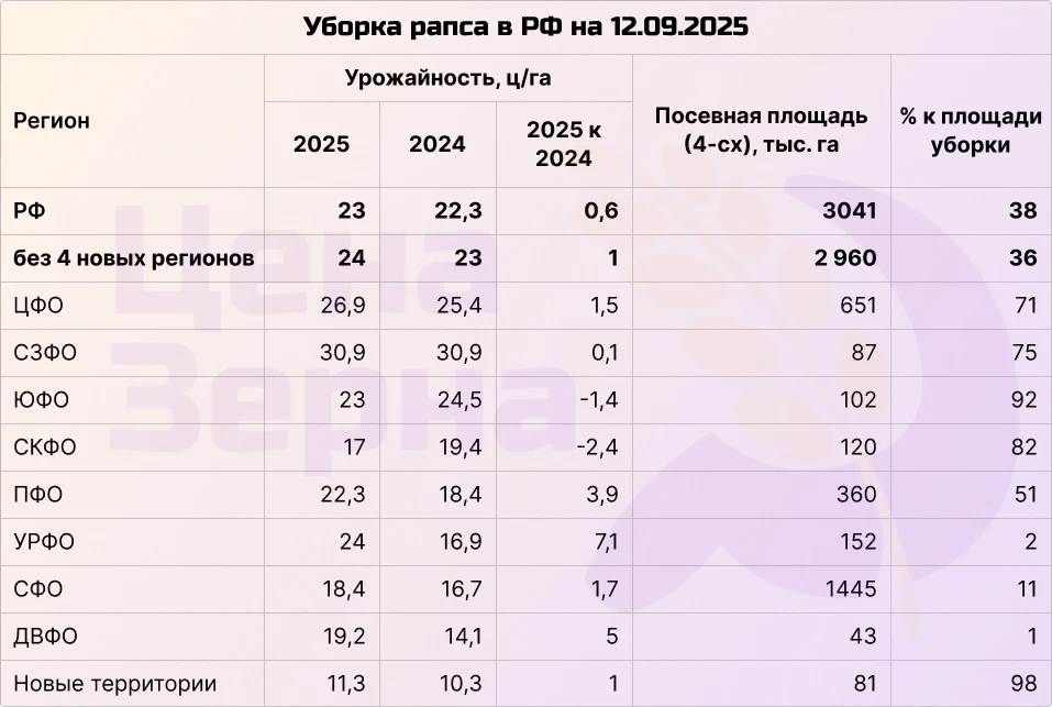 По рапсу ситуация на данный момент остается стабильной: темпы уборки и урожайность не отстают от прошлого сезона. Намолочено примерно 2,6 миллиона тонн с площади около 1,1 миллиона гектаров, что составляет почти 40% от общей посевной площади. Средняя урожайность по стране — 23 ц/га.