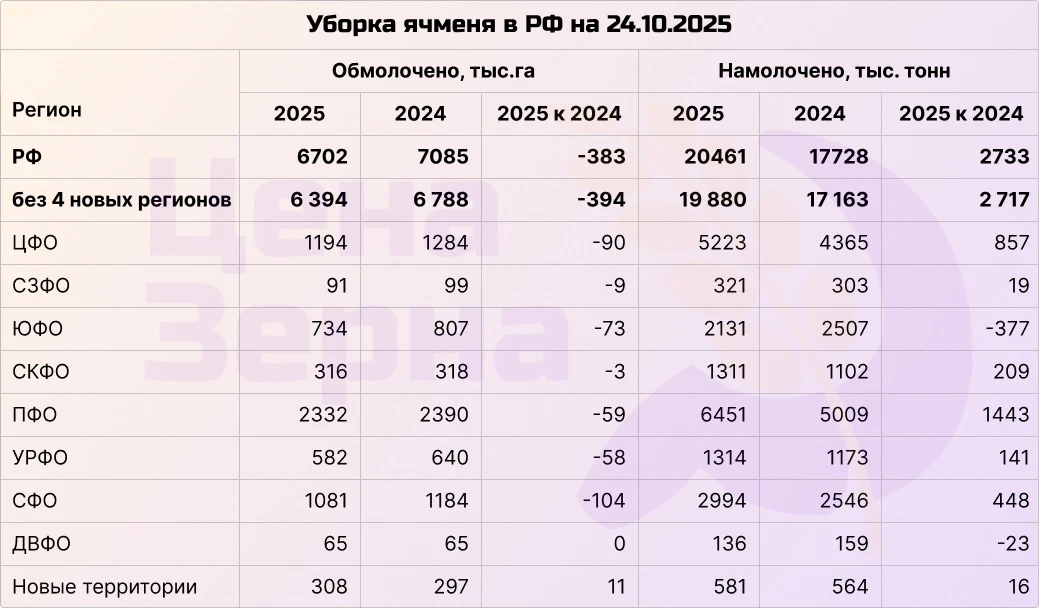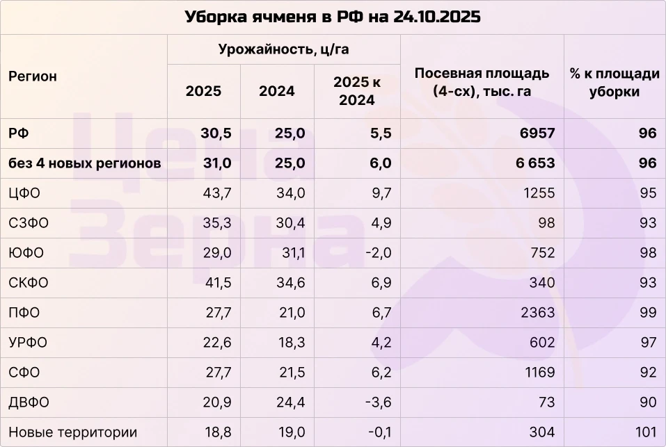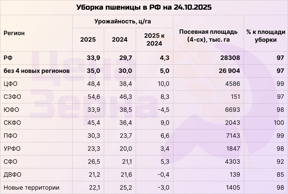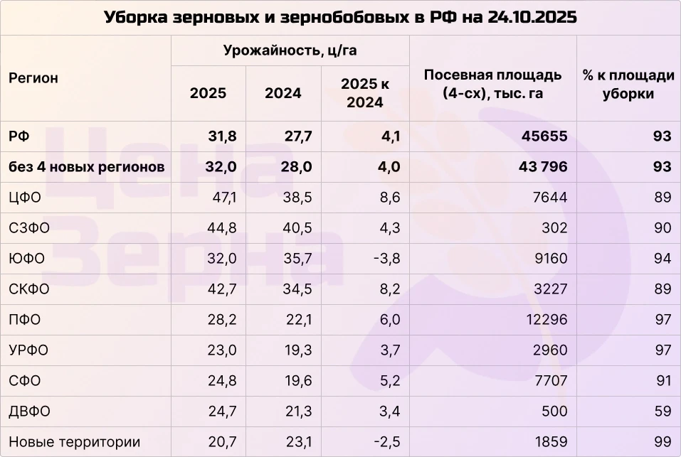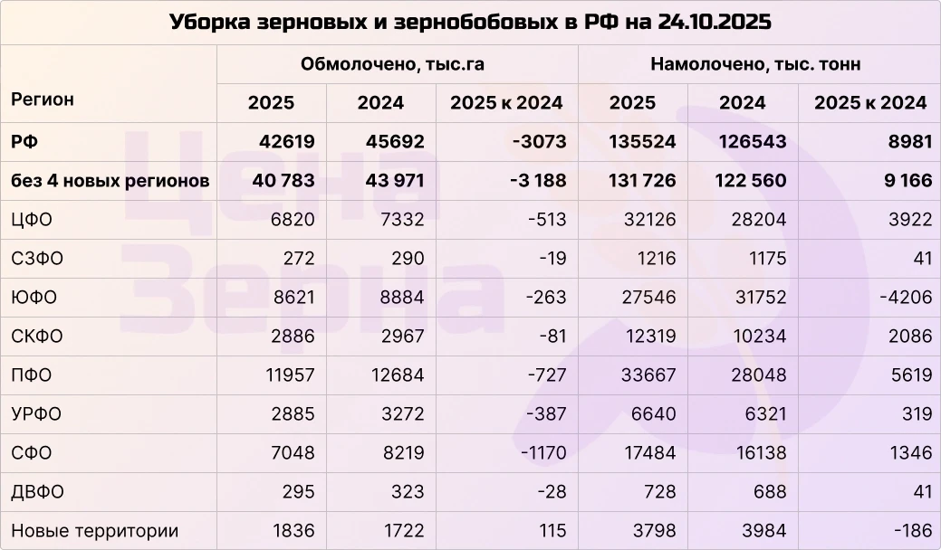 Давайте посмотрим на актуальные данные по уборочной 2025 по зерновым культурам на конец октября.