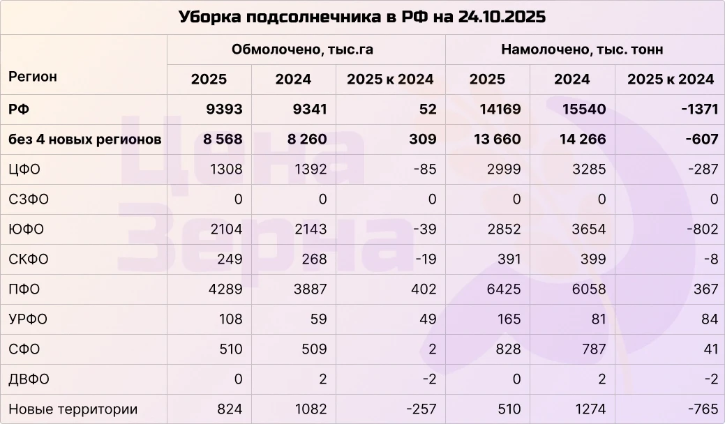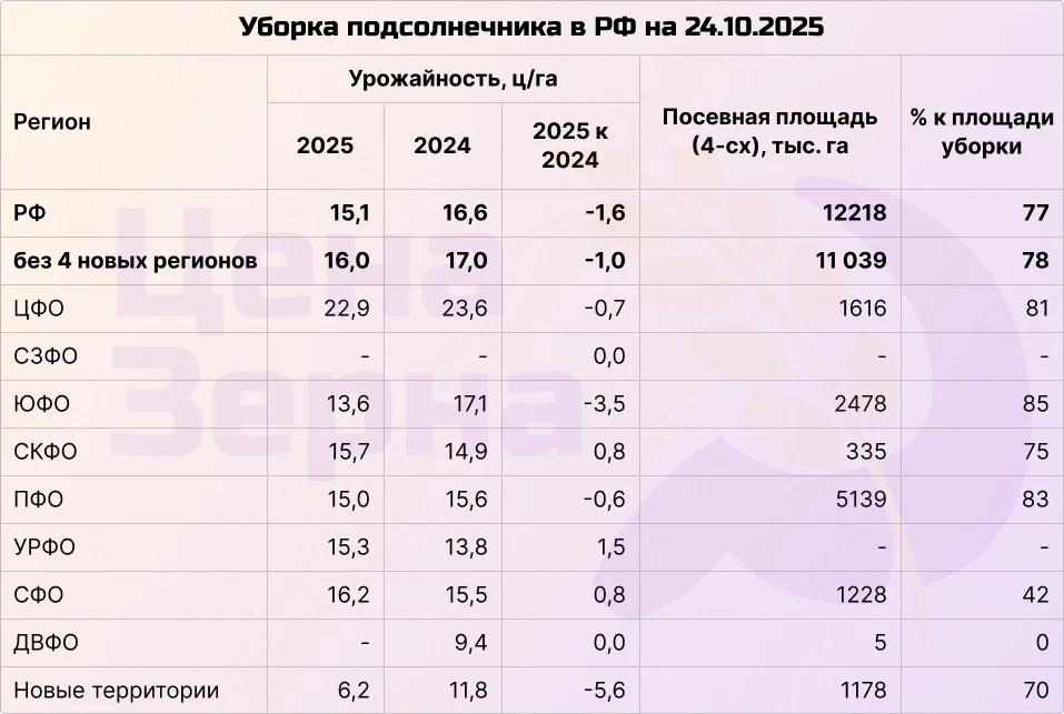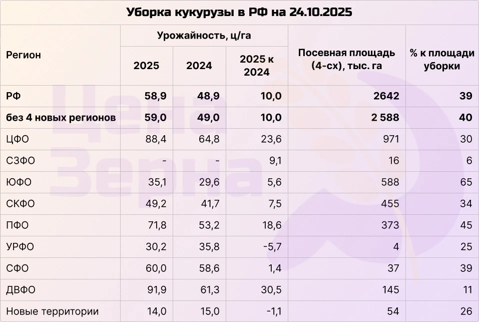 Уборка кукурузы продолжается в активной стадии, уже убрана почти половина. Намолочено более 6 миллионов тонн зерна с площади около 1 миллиона гектаров. Текущие показатели по-прежнему опережают прошлогодние: средняя урожайность по стране достигает почти 59 ц/га, что на 10 центнеров выше уровня прошлого сезона. В то же время, пока фиксируются потери урожайности только на новых территориях и на Урале, в остальных регионах урожай демонстрирует лучшие результаты по сравнению с предыдущим годом.