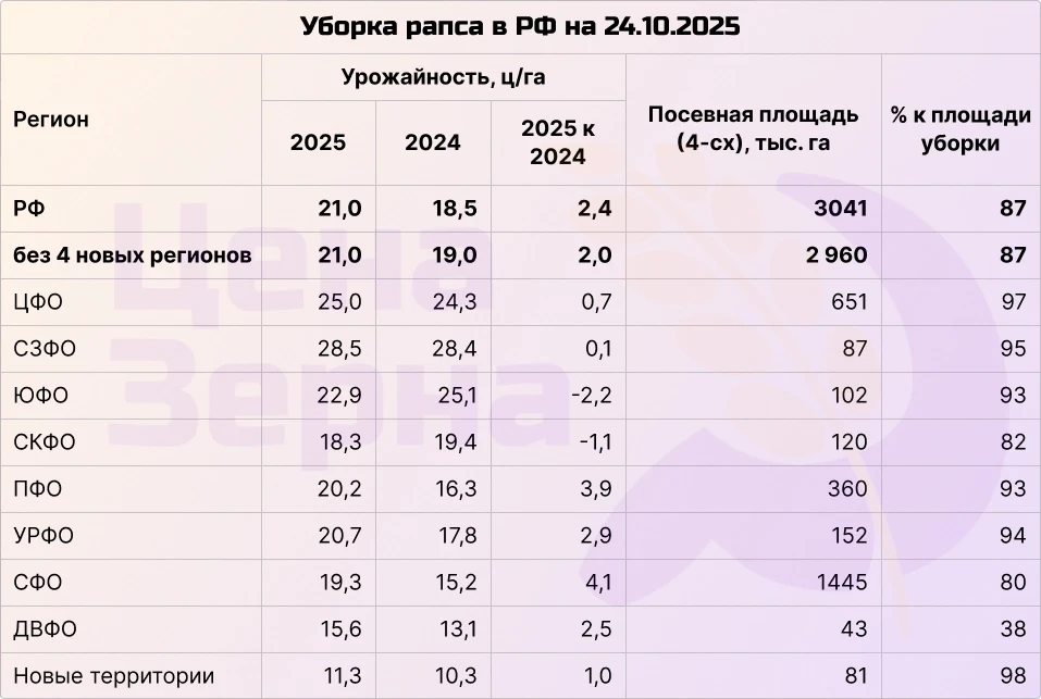 На середину октября в РФ собрано почти 5,5 миллионов тонн рапса, что составляет около 87% от общих уборочных площадей. Уборочная кампания приближается к завершению, и прогнозы оправдались. В Центральном федеральном округе сбор урожая практически завершен — 97%, а в Сибири уборка завершена уже более чем на 80%. Средняя урожайность по стране составляет 21,0 ц/га, что немного превышает прошлогодние показатели — 18,5 ц/га.