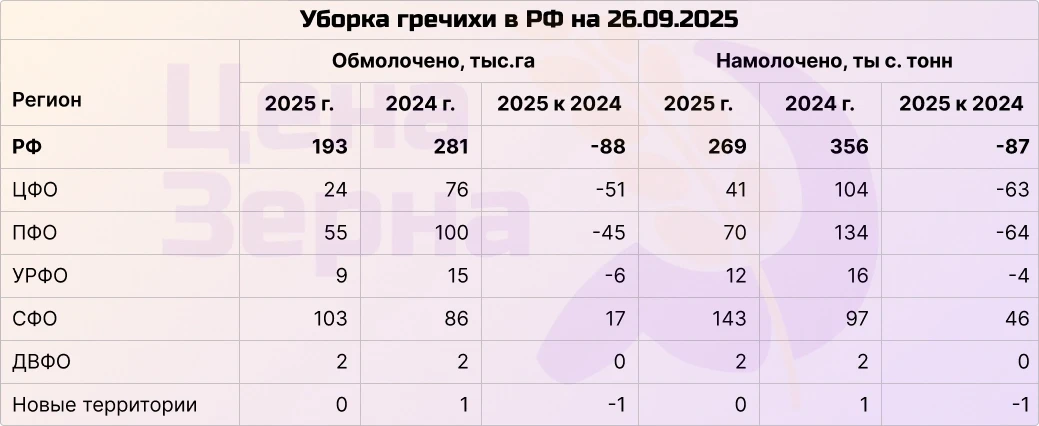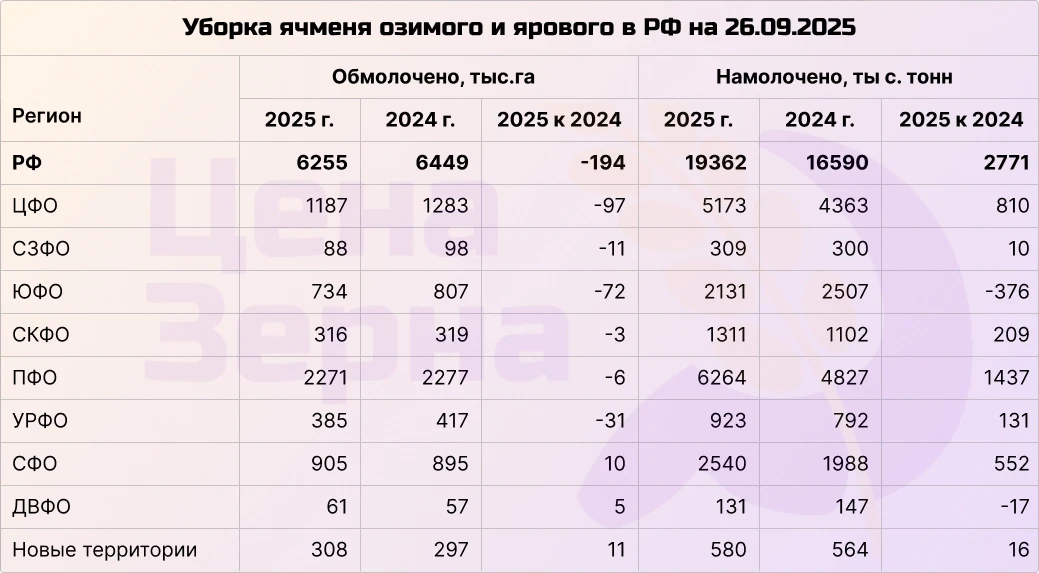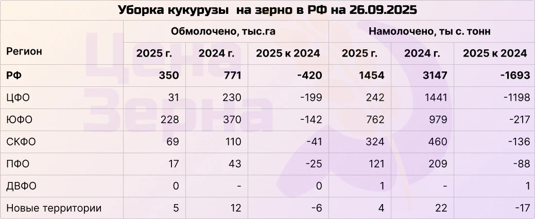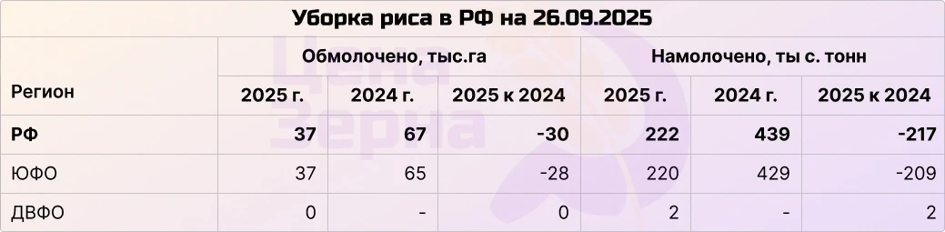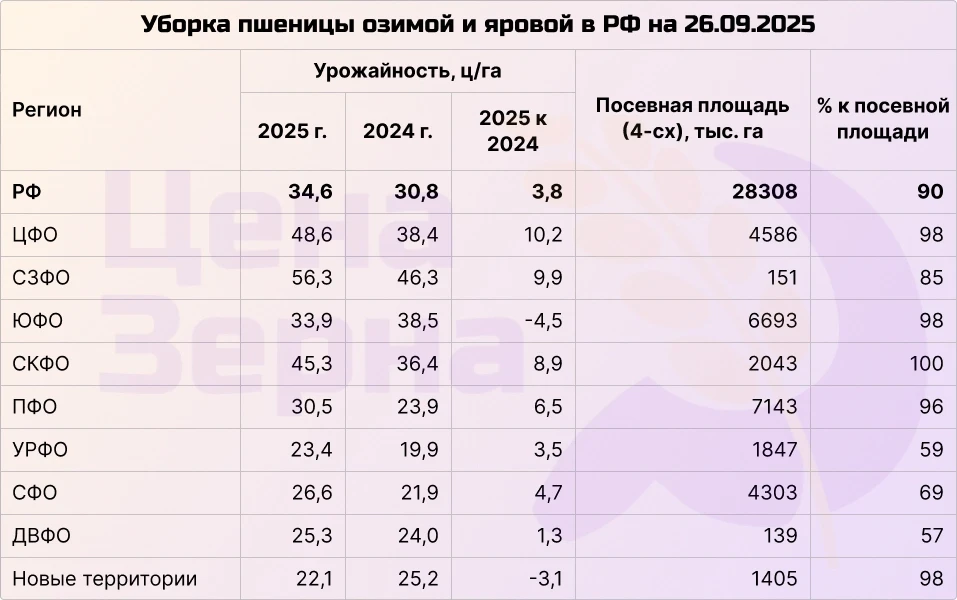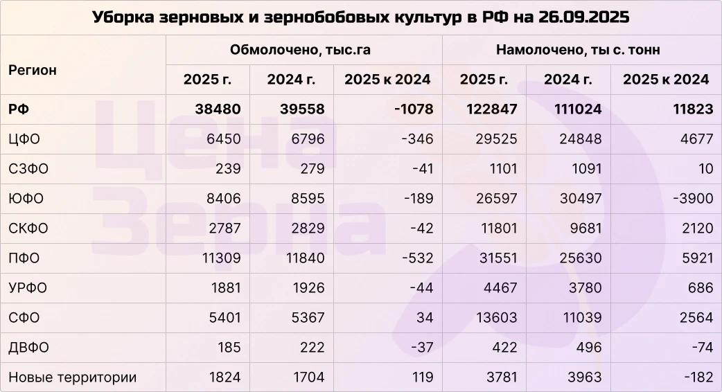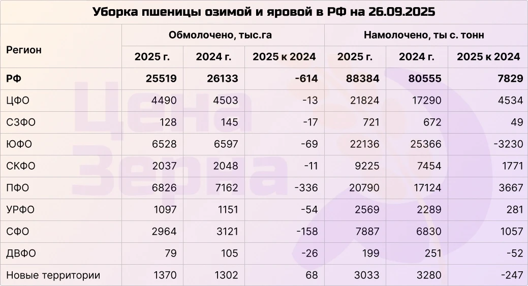Давайте посмотрим на актуальные данные по уборочной 2025 по зерновым культурам на конец сентября.