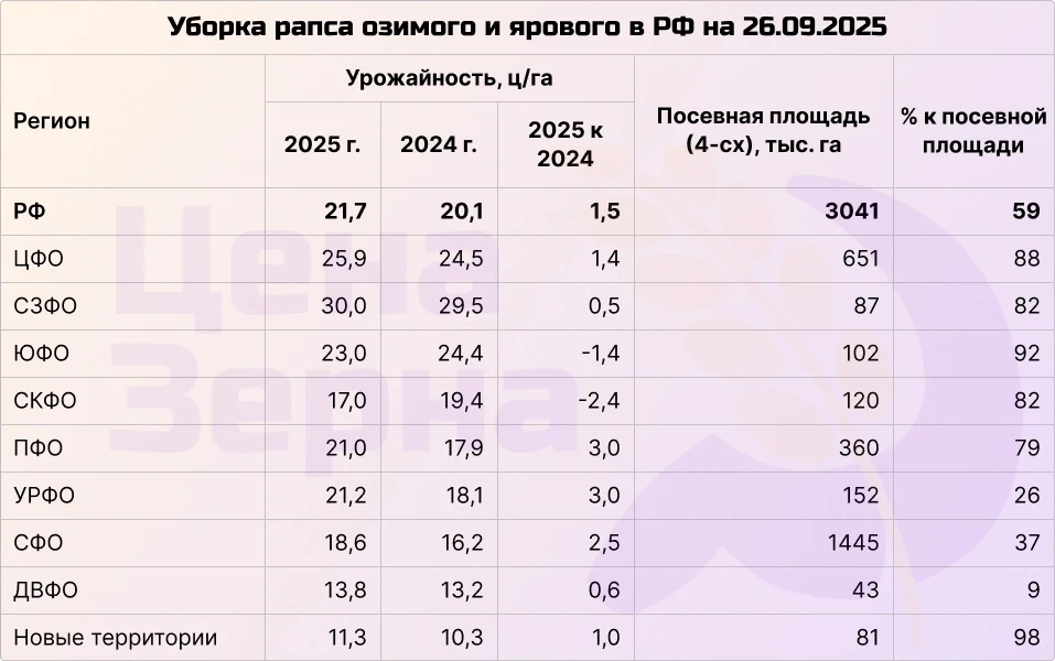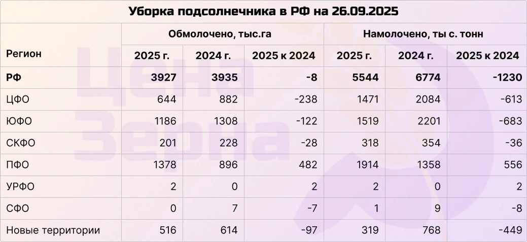 На конец сентября в РФ убрано 3,9 млн гектаров подсолнечника, собрано около 5,5 млн тонн. Лидерство по обмолоченным площадям сохраняет Юг — 48% площади, Центр — 40%, и ПФО — 27%. Урожайность даже в Центре и Поволжье ниже прошлогодних показателей. В новых регионах уборка идет значительно хуже, что негативно скажется на экспорте подсолнечника из этих территорий. Урожайность в лучшем случае не хуже прошлого года, а средняя по стране снизилась на 3,1 ц/га и составляет 14,1 ц/га.