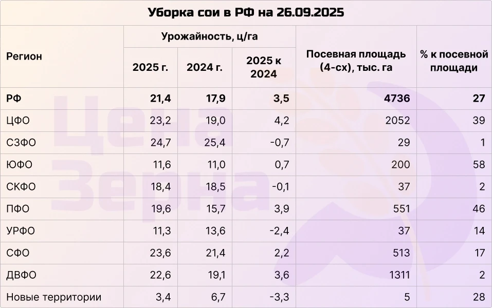 Средняя оценка урожая сои в России на 2025 год повышена до 8,35 млн.т по результатам уборки. На 23 сентября убран 1 млн гектар, собрано более 2,7 млн.т. В Центре и ПФО убрано по 40% площадей. В Сибири старт урожая высок, уборка началась на Дальнем Востоке.