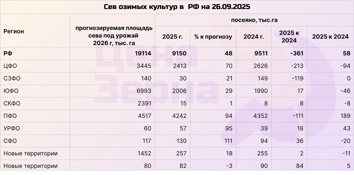 Посев озимых культур прогнозируют на площади почти 20 млн гектаров. Уже засеяно более 9,5 млн гектаров — озимый посев перешел экватор. Наибольшие площади традиционно сосредоточены на юге — около 7 млн гектаров под озимыми культурами.