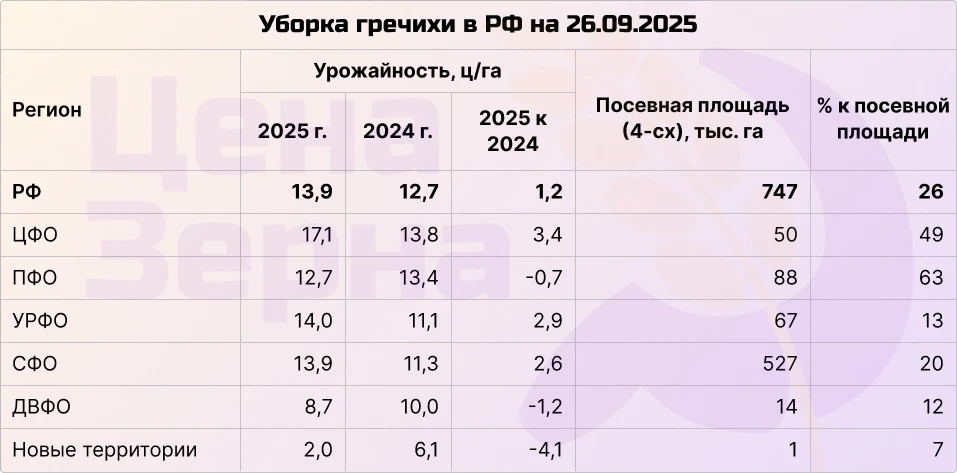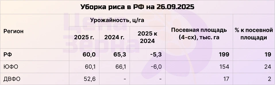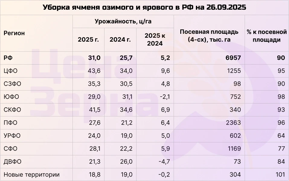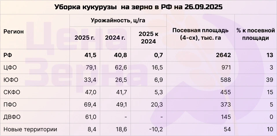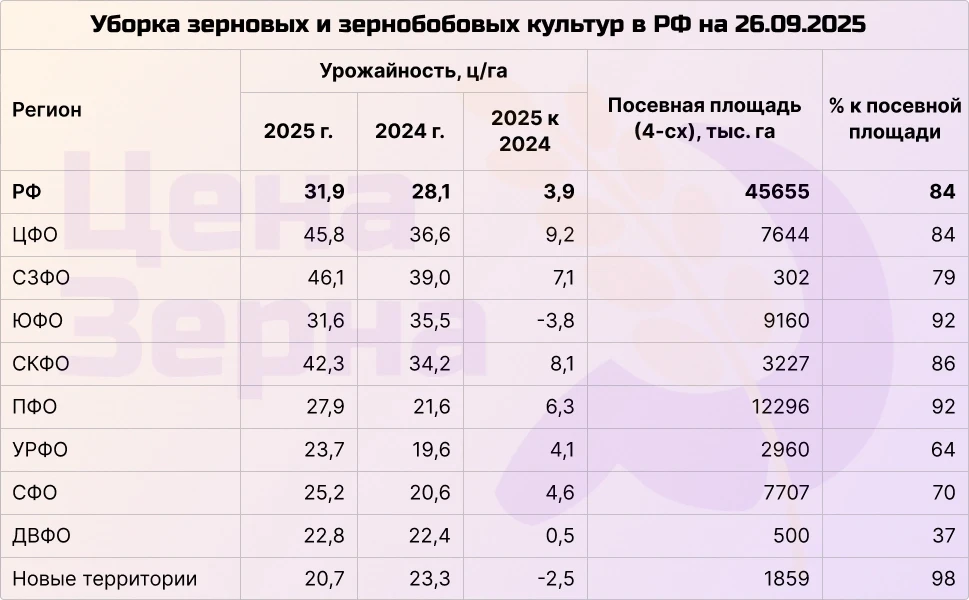 На конец сентября намолочено уже более 123 млн тонн зерна, что на 12 млн тонн больше, чем годом ранее. Уборка переходит в завершающую стадию — осталось убрать около 15% общей посевной площади страны. Юг, Кавказ, Новые Территории и Поволжье убирают последние 10% посевов. Урожайность несколько недель подряд колеблется в пределах 31–33 ц/га, что выше прошлогодних 28 ц/га.