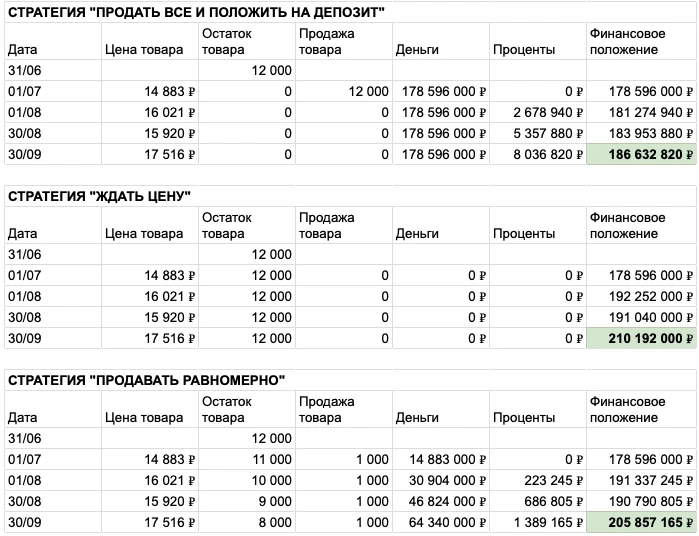 Как посчитать, какая стратегия лучше? Мы на каждую дату будем оценивать финансовое положение фермера - сумму денег на счетах, начисленных процентов по депозиту и текущей стоимости оставшихся запасов пшеницы.