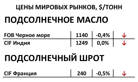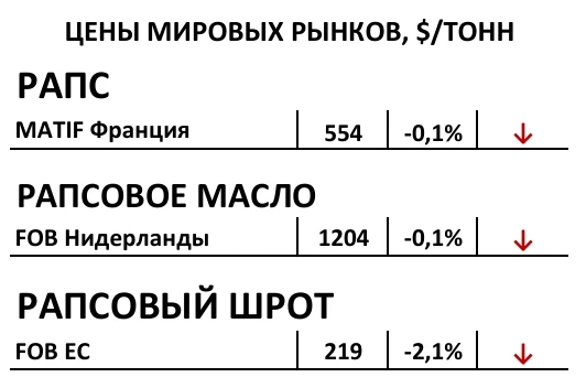 На бирже Euronext фьючерсы на рапс выросли по трем ближайшим контрактам, однако ситуация скорее склоняет к снижению цен из-за обострения торгового конфликта между КНР и Канадой, что может привести Канаду к перенаправлению канолы в Европу. Восстановление производства в ЕС также ограничит рост котировок. Неопределенность по урожаю на Украине и возможным экспортным пошлинам держит рынок в напряжении.