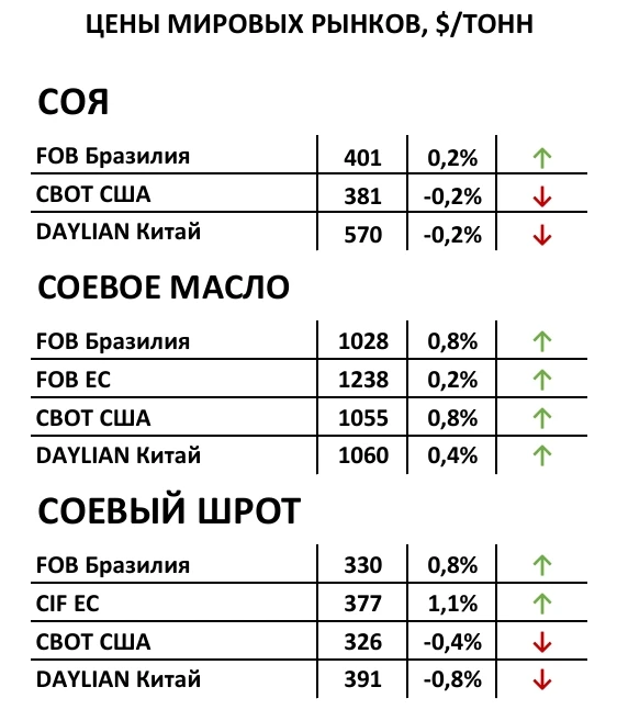 Остатки высокопротеиновой сои сокращаются, что увеличивает спрос на бобы из восточных регионов. Закупочные цены на соевые бобы выросли до 44 000 - 45 000 руб./МТ, однако сохраняется вероятность нехватки высококачественного сырья до конца сезона.