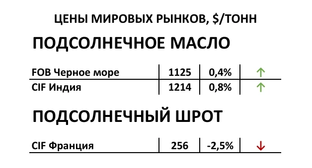 Низкие остатки подсолнечника у продавцов и ограниченный объем под переработку поддерживают закупочные цены в РФ. Реального снижения цен не наблюдается, и в ПФО прошли крупные сделки по повышенным ценам. Дефицит сырья будет наиболее выражен в ЦФО, где сосредоточены основные мощности. На Юге страны низкая загрузка сохранится до конца сезона. Цены на масло и шрот снижаются из-за укрепления рубля, что ухудшает рентабельность переработки.