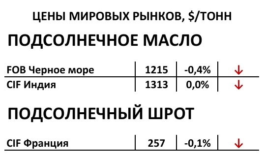 Гендиректор ИКАР Дмитрий Рылько отметил, что цены на масло недавно стабилизировались около 1200 $/Т (FOB Новороссийск), при этом оторвались от цен на соевое и пальмовое масло. Это может привести к снижению спроса и уменьшению цен. На декабрь прогнозируется рост экспортной пошлины на масло до 8,643 тыс. руб./т, (на 1,829 тыс. руб. больше, чем в ноябре). Индикативная цена на подсолнечный шрот для пошлины — 210,9 $/Т (17,104 тыс. руб.), что обусловит пошлину в 860 Руб./Т.