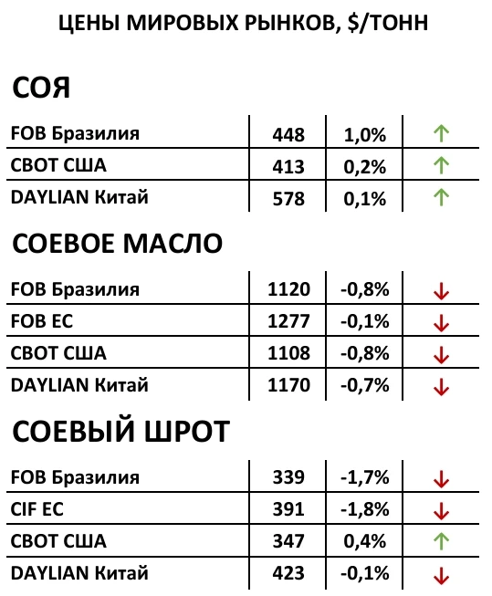Цены на сою снизились с летних 40 тыс. руб./т до 31-32 тыс. руб./т в ноябре, из-за рекордного урожая в 8,6 млн.т и средней урожайности 21 ц/га. Внутренний рынок перенасытился, что позволяет поставлять сою на внешние рынки, преимущественно в виде шрота. Несмотря на высокие урожаи и хорошие показатели, цены снизились, что ухудшает рентабельность выращивания сои.