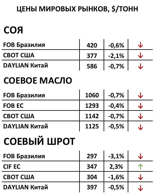 На Даляньской бирже цены также снизились из-за аналогичных причин. В КНР объем переработки соевых бобов за неделю вырос до 2,3 млн.т, запасы — до 6,4 млн.т