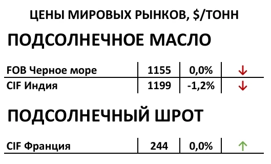Индикативные котировки подсолнечного масла со стороны Турции выросли до 1 178 $/Т (CIF Мармара), ставка фрахта — 45 $/Т. По экспортному паритету на июль цена для Турции составляет 1 106 $/Т (FOB Малая вода). В Индии цены снизились до 1 200 $/Т (CIF Ченнай), при фрахте 63 $/Т — цена FOB около 1 111 $/Т (Большая вода). Внутренние цены остались стабильными: в портах они достигали 88 000 руб./Т с НДС CPT (Тамань), а предложения экспортеров — в диапазоне 86 000–88 000 руб./Т. Внутренние сделки более выгодны: в ЦФО — около 87 000 руб./Т с НДС EXW, а РДВ-налив — около 97 000 руб./Т с НДС EXW.