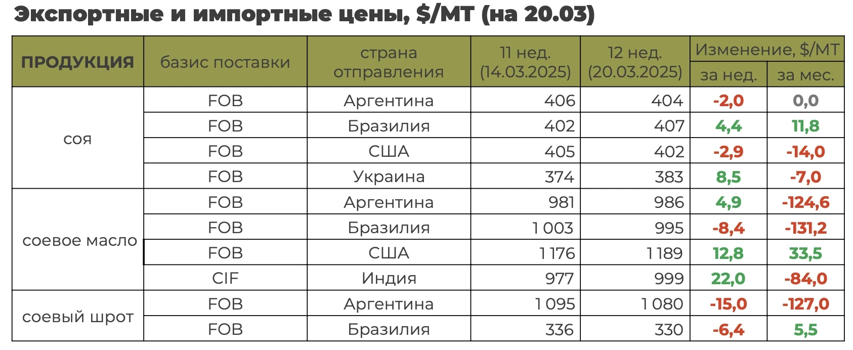 На Чикагской бирже фьючерсы на сою на отчетной неделе незначительно выросли на 4 $/MT благодаря засушливым условиям в Бразилии, что привело к снижению прогноза производства сои до 165,9 ММТ.