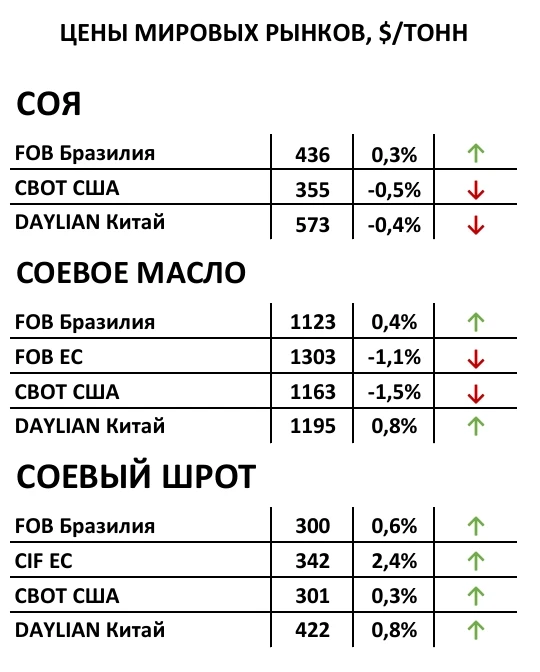 На Чикагской бирже фьючерсы на сою выросли незначительно за отчетный период, а цены на соевое масло снизились, а шрот вырос. Ожидания высокого урожая в США и рекордный сбор в Бразилии оказывают давление на цены. Торговая напряженность между США и Китаем и низкий спрос со стороны главного импортера сдерживают рост.