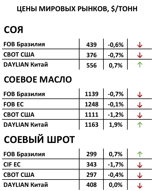 Урожайность сои в РФ бьёт рекорды благодаря высоким результатам в Поволжье, Сибири и Дальнем Востоке. Прогноз урожая повышен с 8,4 до 9,5–9,6 млн.т, причём эта оценка сдержанная — даже в худшем сценарии сбор не опустится ниже 9,2 млн.т. Сезон сопровождается перепроизводством, что ставит вопрос о сбыте соевого шрота. Мощности для переработки есть, но продажи сырья могут стать проблемой. Возникает вопрос о необходимости импорта ГМО-бобов из Южной Америки и о возможном росте экспорта сои из РФ. Также остаётся открытым, пойдут ли власти на смягчение экспортных пошлин (сейчас 20%), чтобы поддержать рентабельность. Закупочные цены в регионах уже идут вниз, и это, вероятно, только начало снижения.
