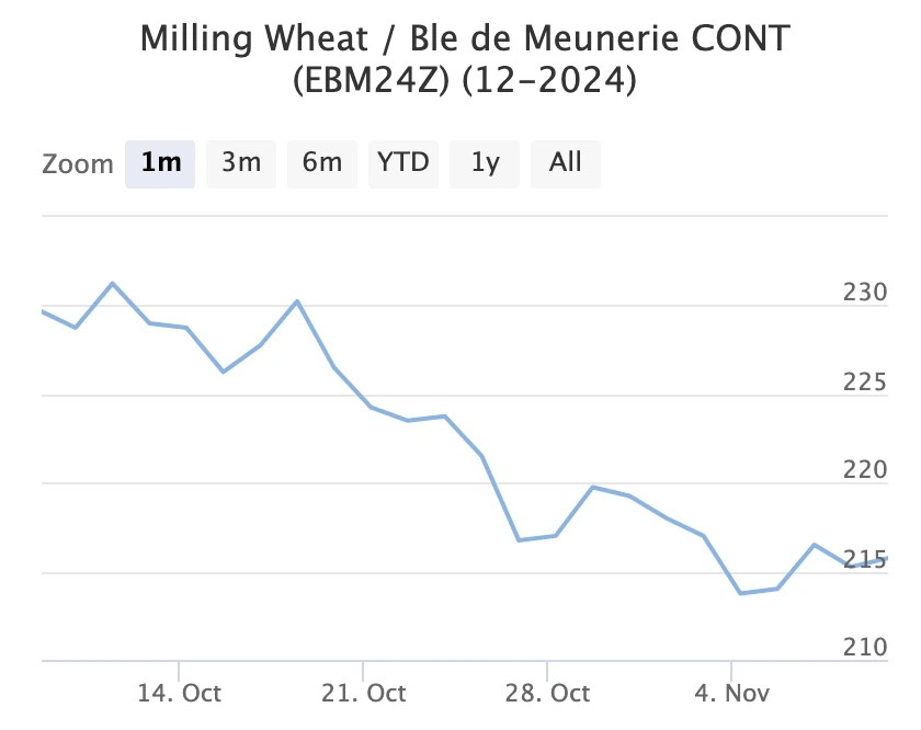 Спред между французской и российской культурой, которая традиционно дешевле, с начала сентября сократился с 19 $/МТ до 9 $/МТ. На последнем тендере Алжира (31.10), по неофициальным данным, французская пшеница была исключена из участия, а на египетском тендере GASC (04.11) предпочтение было отдано зерну с Украины, Румынии и Болгарии. В условиях обострения взаимоотношений с Алжиром Франция заявила в четверг, что ей неизвестно о каких-либо официальных мерах Алжира в отношении французского экспорта (напоминаем, по неофициальным данным, Алжир не допускает французскую пшеницу до участия в своих тендерах), однако дипломатические источники предполагают, что Алжир может готовить торговые ограничения. В перспективе это может оказать давление на котировки в ЕС.