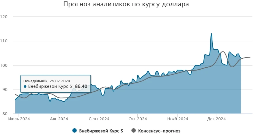 Эксперты ожидают, что в ближайшее время существенных изменений в курсах валют ожидать не стоит. Прогноз на ближайшие дни в среднем составляет 103,2 рубля за 1 доллар США.