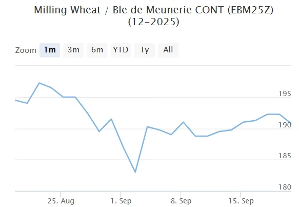 В США поддержку фьючерсам оказал рост экспортных продаж пшеницы — за 5–11 сентября объем чистых продаж вырос на 24% до 377,4 тыс. тонн, а также подписано соглашение с Тайванем на закупку 3,6 млн тонн пшеницы за три года. Однако рынок остаётся медвежьим из-за близкого завершения уборки (94% по состоянию на 14 сентября) и прогнозируемых дождей в регионах озимой пшеницы. Прогноз урожая канадской пшеницы на 2025/26 год повышен до 36,6 млн тонн, что также давит на цены. В Европе котировки пшеницы выросли на фоне повышения экспортных цен на причерноморскую пшеницу и ожиданий увеличения европейских экспортных поставок.