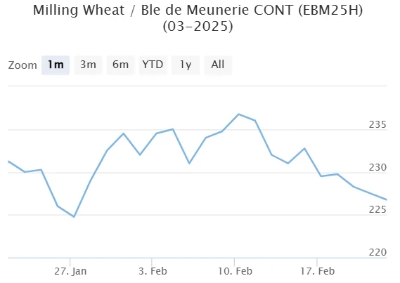 Европейские котировки за отчетную неделю показывали снижение или стагнацию из-за охлаждения геополитической напряженности в Причерноморье и слабых экспортных показателей. По данным Еврокомиссии, экспорт мягкой пшеницы из ЕС с начала сезона составил 13,3 ММТ (-36% к АППГ). В период с 10 по 16 февраля вывоз снизился до 243 ТМТ (-29% к предыдущей неделе, -43% к АППГ), что является худшим показателем с начала 2025 года.