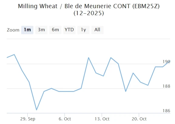 Фьючерсные котировки основных зерновых на биржах CBoT и MATIF в отчетный период показывали разнонаправленное движение. Статистика USDA недоступна из-за прекращения финансирования. В течение недели фьючерсы на американскую HRW-пшеницу достигли новых минимумов, а на SRW оставались под давлением из-за засухи в некоторых регионах. IGC в отчёте по рынку зерна на сезон 25/26 повысил прогноз производства пшеницы до 827,5 млн.т (+8,8 млн.т к сентябрю), увеличив запасы и экспорт. Стоимость французских контрактов снизилась из‑за высокой конкуренции. В Европе и Марокко фиксировались закупки аргентинской и причерноморской пшеницы. Геополитическая напряженность США с другими странами добавляют неопределенности рынку.