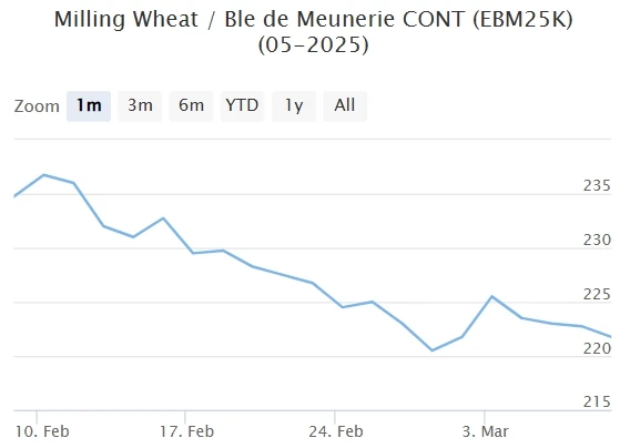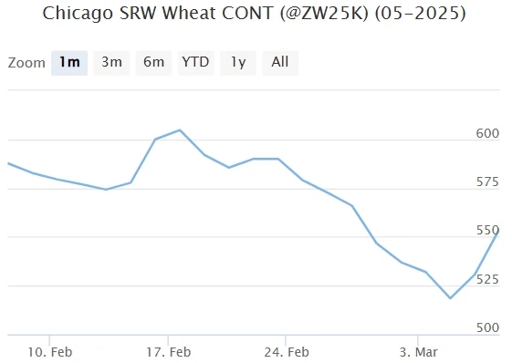 Начальная реакция фьючерсных цен была снижением, однако 6 марта США приостановили действия тарифов на товары из Мексики и Канады, а Канада отложила новые пошлины до апреля. В качестве поддержки цен выступил рост экспортных поставок: с 21 по 27 февраля объем чистых продаж пшеницы из США составил 338,7 тыс. тонн. Европейский рынок же движется вниз из-за отсутствия значимых факторов поддержки.