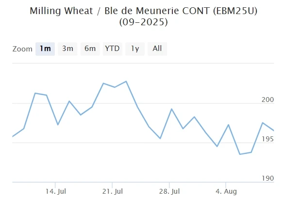 Мировой рынок остается под влиянием уборочной кампании. Внутренний рынок России показывает разнонаправленные движения: на Юге цены выросли на 600–650 руб./Т, в Центре — снизились на 600–1200 руб./Т, особенно по фуражной пшенице. В целом, цены остаются стабильными или снижаются, что свидетельствует о достаточном предложении и отсутствии дефицита продовольственной пшеницы. По состоянию на 07.08 в России намолочено около 50,9 млн т пшеницы против 53,8 млн т за аналогичный период прошлого года.
