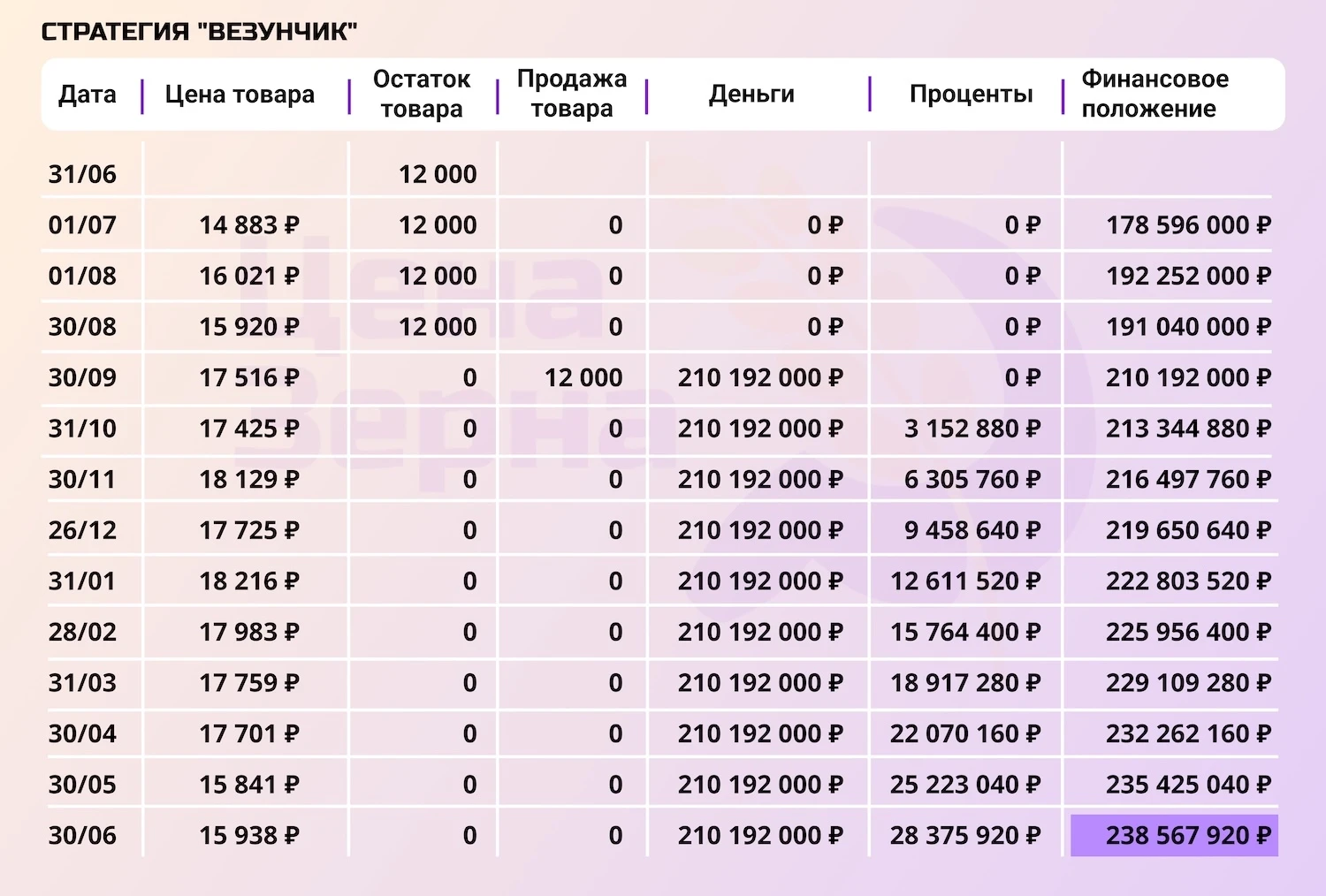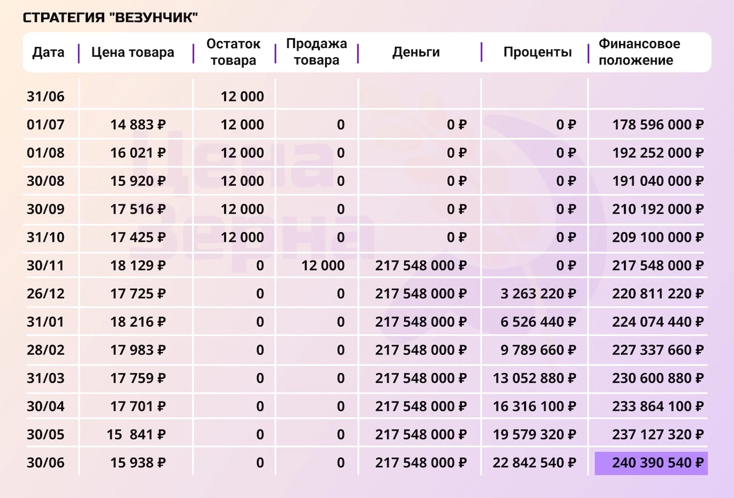 “Везунчик” зарабатывает на 13 млн рублей больше, чем стратегия “продавать равномерно”, выбившаяся в лидеры среди трех базовых сценариев.