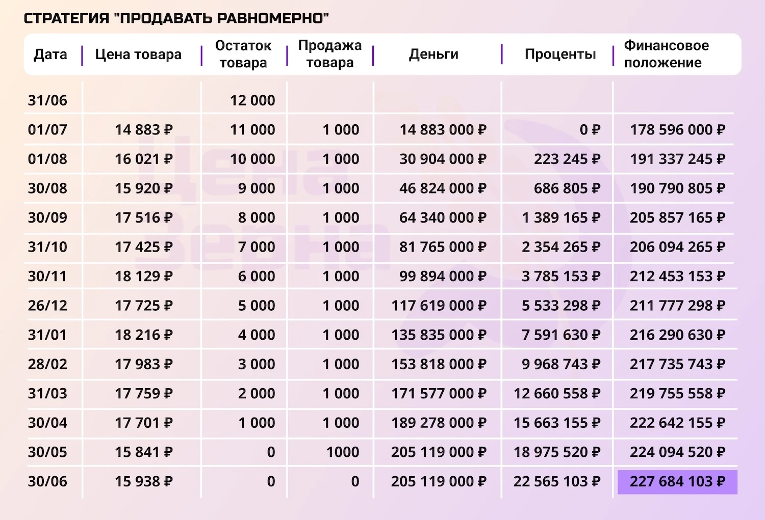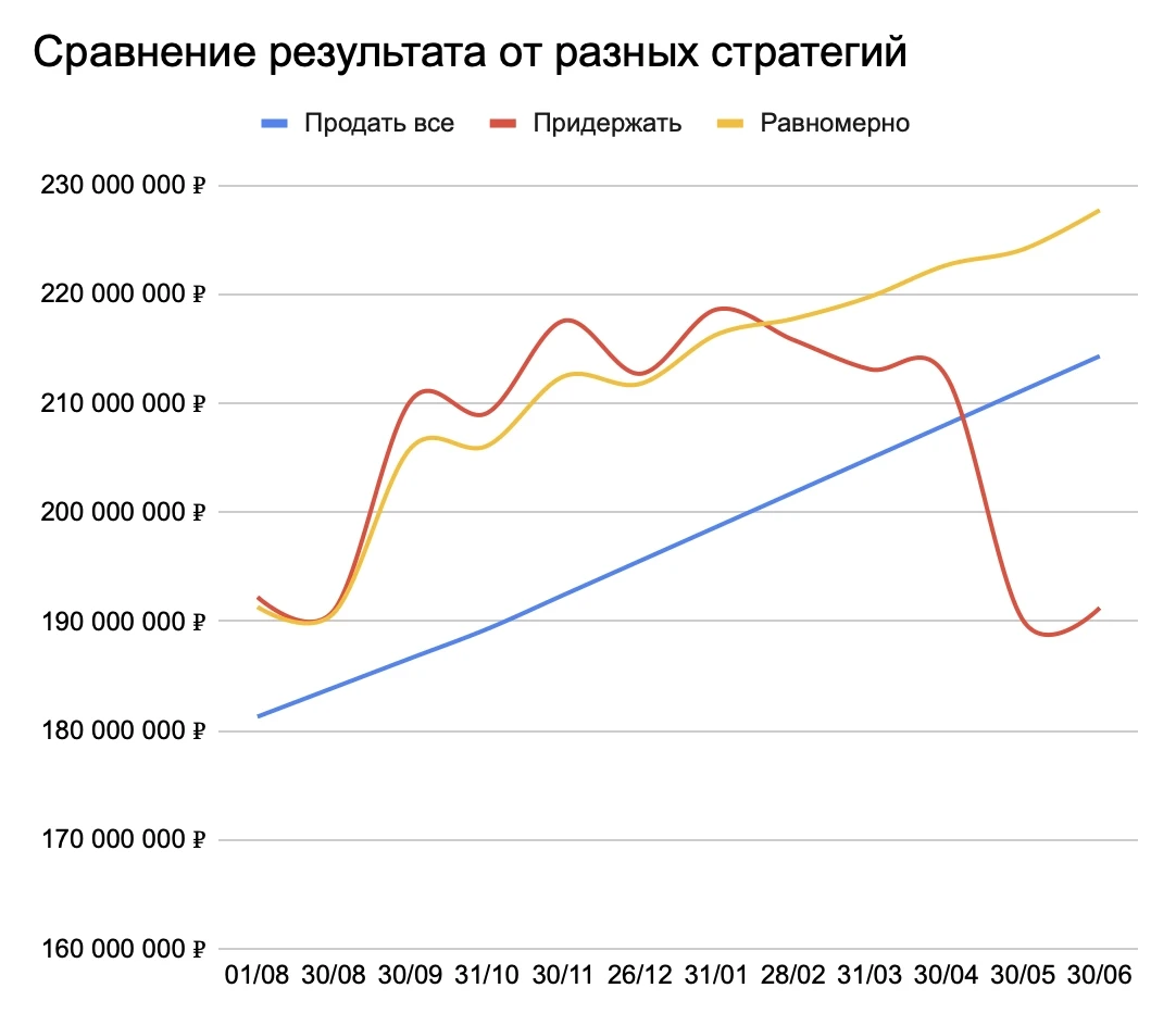 3) ⚖️ Продавать равными партиями, усредняя цену. Для простоты разобьем объем на 12 равных частей и продавать каждую из них в начале месяца.