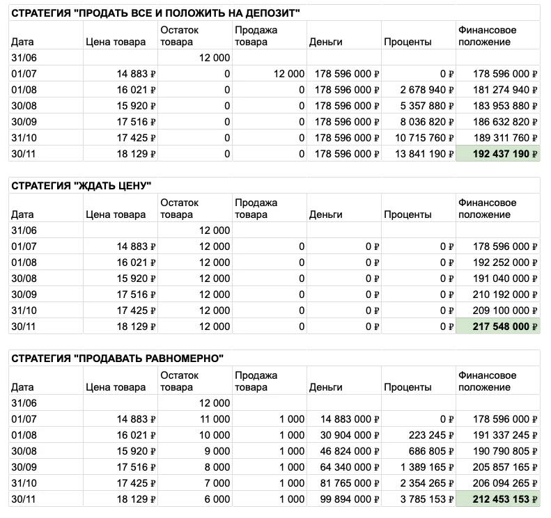 Как посчитать, какая стратегия лучше? Мы на каждую дату будем оценивать финансовое положение фермера - сумму денег на счетах, начисленных процентов по депозиту и текущей стоимости оставшихся запасов пшеницы.
